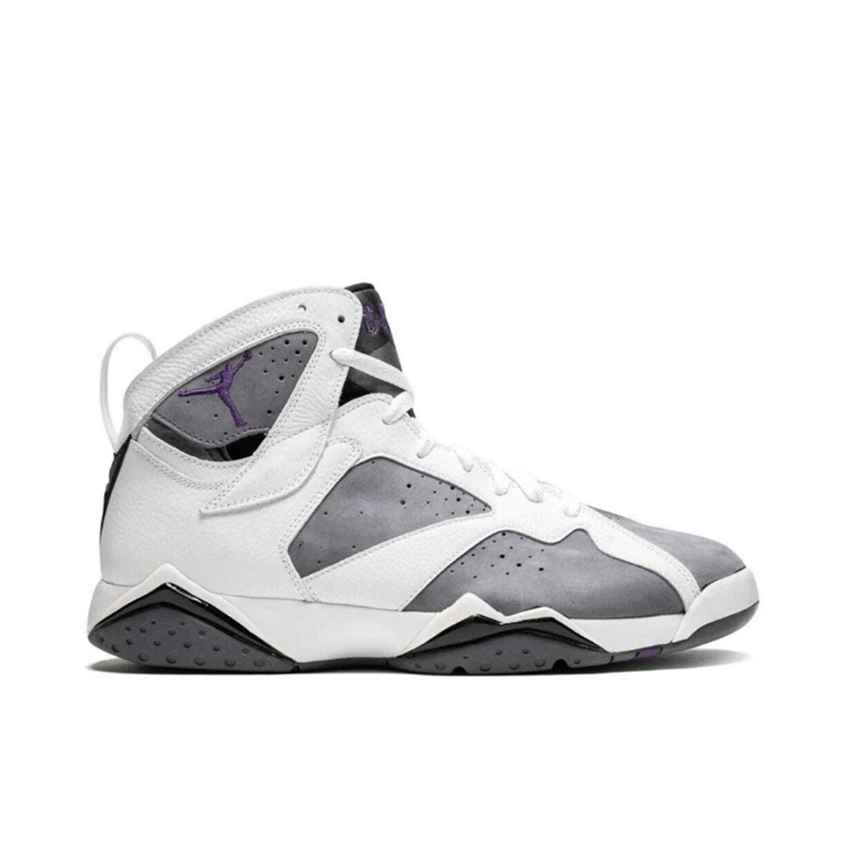 As always with the timeless Air Jordan 7 silhouette, embracing the retro is a must, and the Air Jordan 7 Retro Flint 2021 sneaker has it all. The understated colorway provides a jagged cut cage-like upper in premium white leather offset against soft grey suede paneling for a clean finish. The grey back fabric panels also include a perforated design, not only for breathability but for a little extra style. The holed pattern continues for the matching grey rubber outer sole, which also includes a jagged glossy black border in patent leather and a cut white midsole for a bold effect. The tall Air Jordan 7 Retro Flint 2021 silhouette is complete with a vibrant purple Jumpman logo on the collar, offset perfectly against its grey suede background. The purple continues for the logo adornment on the black and grey tongue, with white laces to finish.