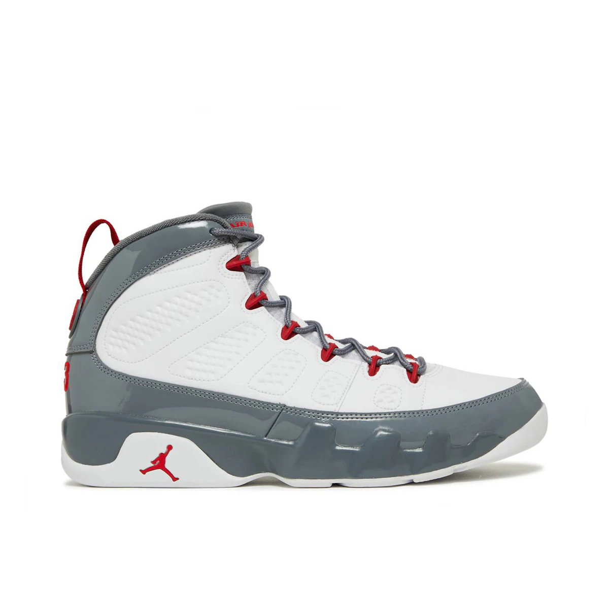 Air Jordan 9 Fire Red gives the much-loved Air Jordan 9 a vibrant update. The unique sneaker design features a splash of Fire Red on its heel tab, lace eyelets, tongue, and the iconic Jumpman branding. Red accents pop against the white leather upper and grey patent leather panels along the collar and mudguard. The Jordan Brand continues to prove less is more for classic sneakers, as they have stuck with simple retro colorways that demand attention. The iconic Fire Red has previously appeared on other designs, such as Air Jordan 3, Air Jordan 4, Air Jordan 5, and many more Nike Swoosh sneakers.
