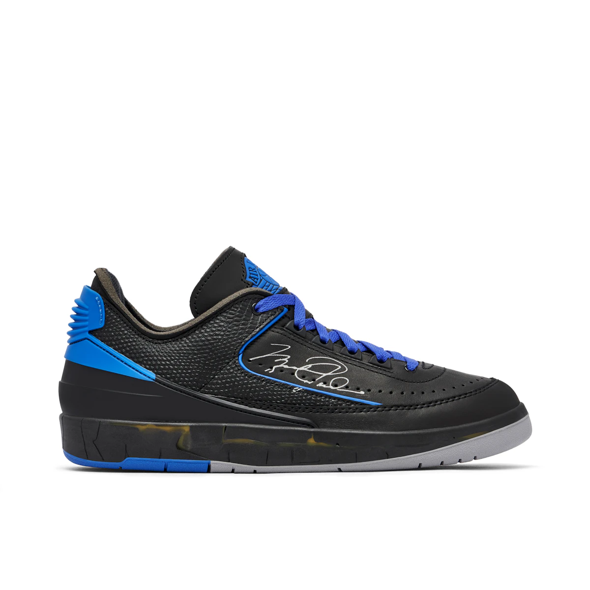 Introducing the Off-White x Air Jordan 2 Low Black: a stand-out style you can trust and wear absolutely anywhere. Made up primarily of premium black leather, this shoe includes subtle accents of bright blue on the side panel bordering, on the outer sole, heel tab, and tongue to add a touch of character. This sneaker also features a textured black fabric panel offset against the smooth leather, adding another layer of sleek definition. Black laces are incorporated seamlessly into the design, whilst a textured outsole underfoot grounds the pair with all-important grip. To finish, Michael Jordan’s signature is scrawled in white on the side of the Off-White x Air Jordan 2 Low Black: a statement sneaker that you’ll never want to take off.